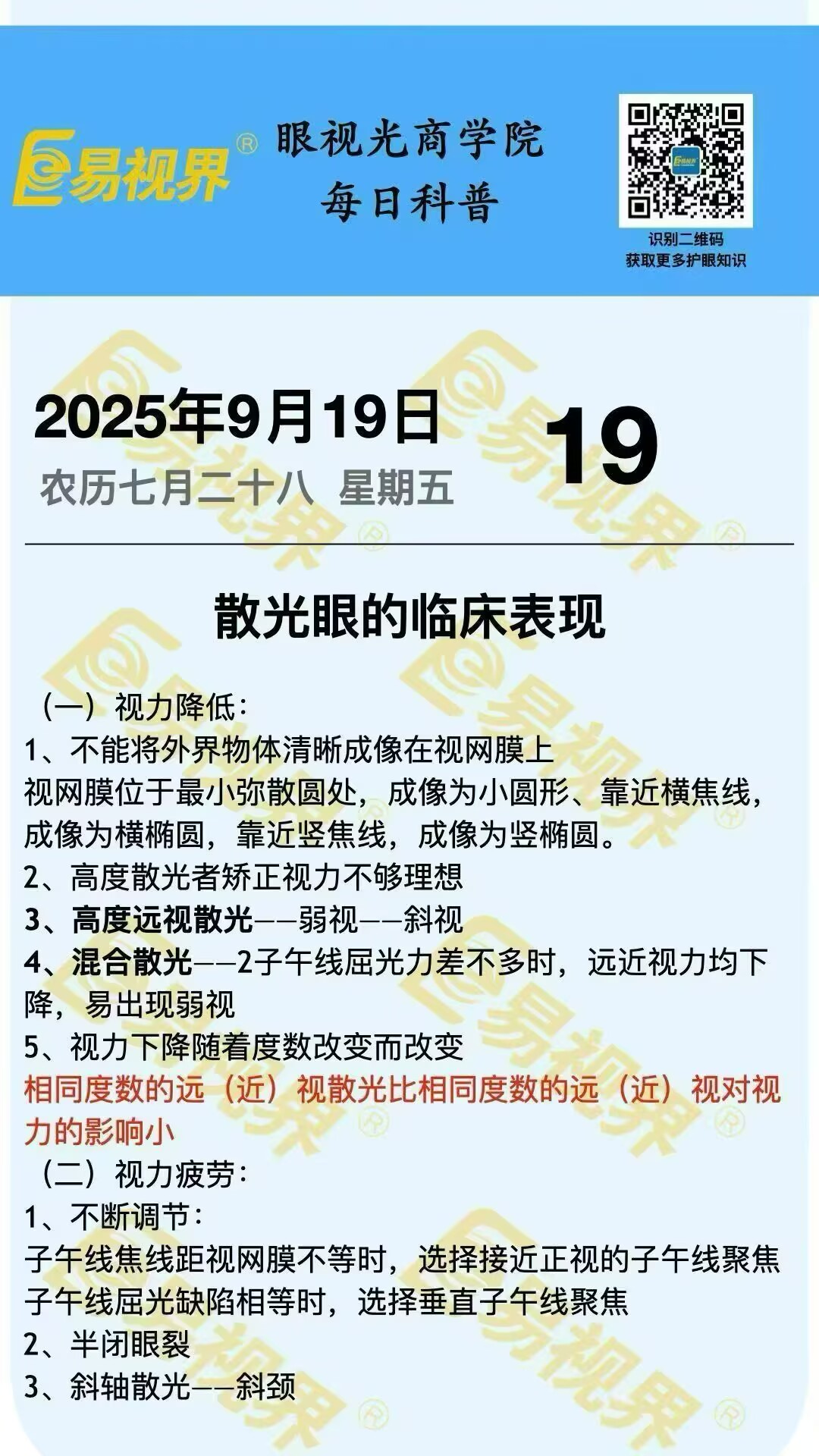 (一)视力降低:1、不能将外界物体清晰成像在视网膜上视网膜位于最小弥散圆处,成像为小圆形、靠近横焦线,成像为横椭圆,靠近竖焦线,成像为竖椭圆。2、高度散光者矫正视力不够理想3、高度远视散光——弱视——斜视4、混合散光——2子午线屈光力差不多时,远近视力均下降,易出现弱视5、视力下降随着度数改变而改变相同度...