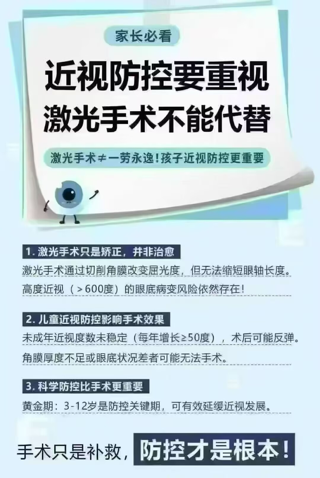 激光手术*一劳永逸!孩子近视防控更重要1.激光手术只是矫正,并非治愈激光手术通过切削角膜改变屈光度,但无法缩短眼轴长度。高度近视(>600度)的眼底病变风险依然存在!2.儿童近视防控影响手术效果未成年近视度数未稳定(每年增长≥50度),术后可能反弹。角膜厚度不足或眼底状况差者可能无法手术。3.科学防控比手术更...