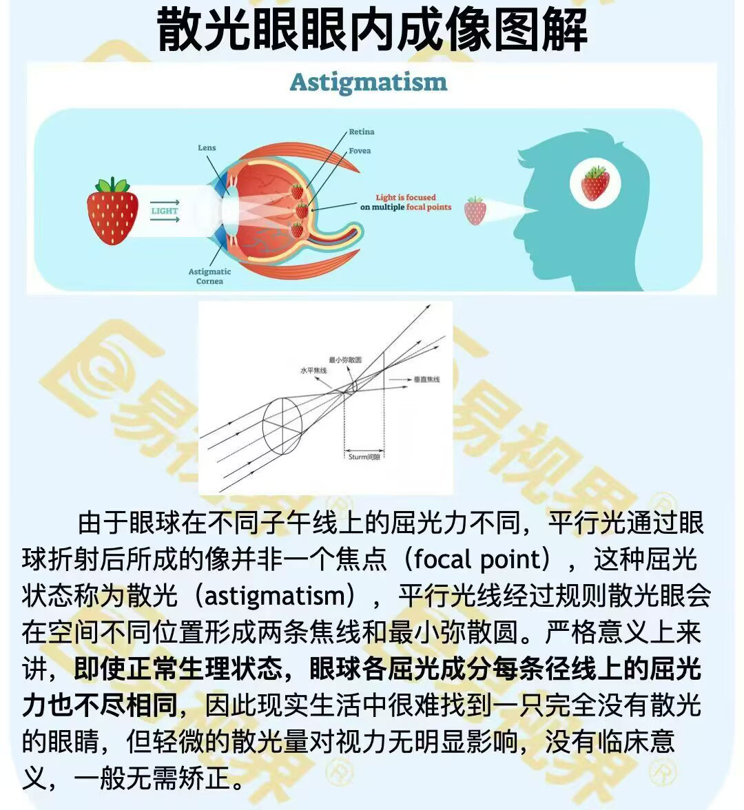 由于眼球在不同子午线上的屈光力不同,平行光通过眼球折射后所成的像并非一个焦点(focalpoint),这种屈光状态称为散光(astigmatism),平行光线经过规则散光眼会在空间不同位置形成两条焦线和最小弥散圆。严格意义上来讲,即使正常生理状态,眼球各屈光成分每条径线上的屈光力也不尽相同,因此现实生活中很难找到一只完全...