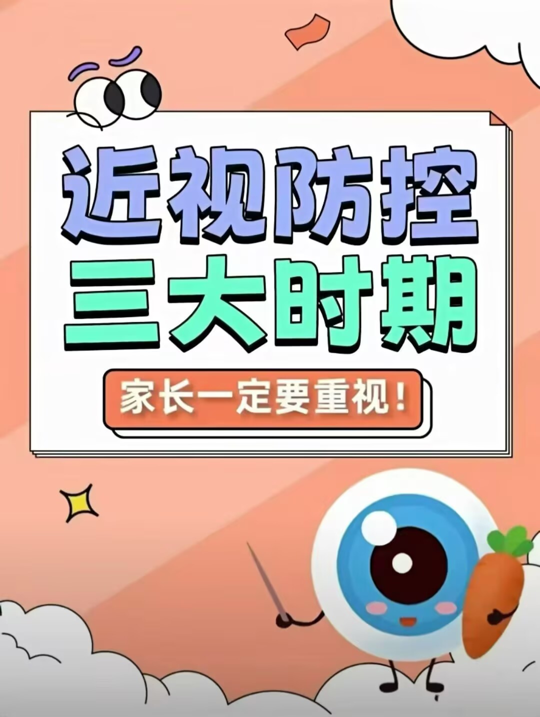 0一6岁关键期0-6周岁阶段。孩子视觉系统处于快速发展及完善阶段,也是早期近视预防关键期。此阶段以多户外,减少长时间近距离用眼等行为为主。3岁起,每3一6个月做一次视力检检测,监测孩子裸眼视力及远视储备变化。7-12岁黄金期小学低年级阶段,课业加重,户外减少,是近视的高发期,也是近视防控的“黄金期”。注意科学用...