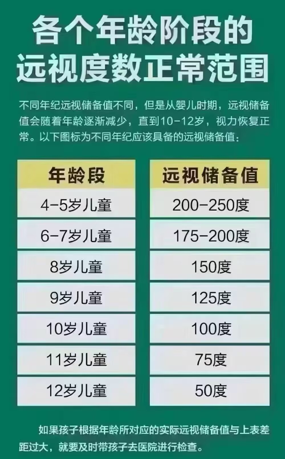 不同年纪远视储备值不同,但是从婴儿时期,远视储备值会随着年龄逐渐减少,直到10-12岁,视力恢复正常。以下图标为不同年纪应该具备的远视储备值:年龄段 远视储备值4-5岁儿童 200-250度6-7岁儿童 175-200度8岁儿童 150度9岁儿童 125度10岁儿童 100度...