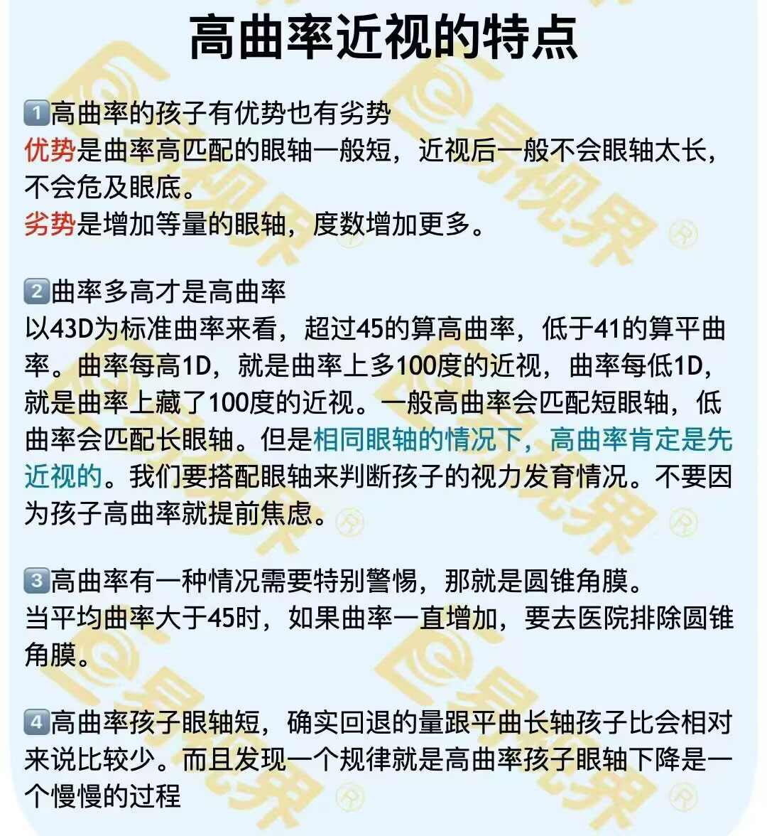 高曲率的孩子有优势也有劣势。优势是曲率高匹配的眼轴一般短,近视后一般不会眼轴太长,不会危及眼底。劣势是增加等量的眼轴,度数增加更多。曲率多高才是高曲率?以43D为标准曲率来看,超过45的算高曲率,低于41的算平曲率。曲率每高1D,就是曲率上多100度的近视,曲率每低1D,就是曲率上藏了100度的近视。一般高曲率会匹配...